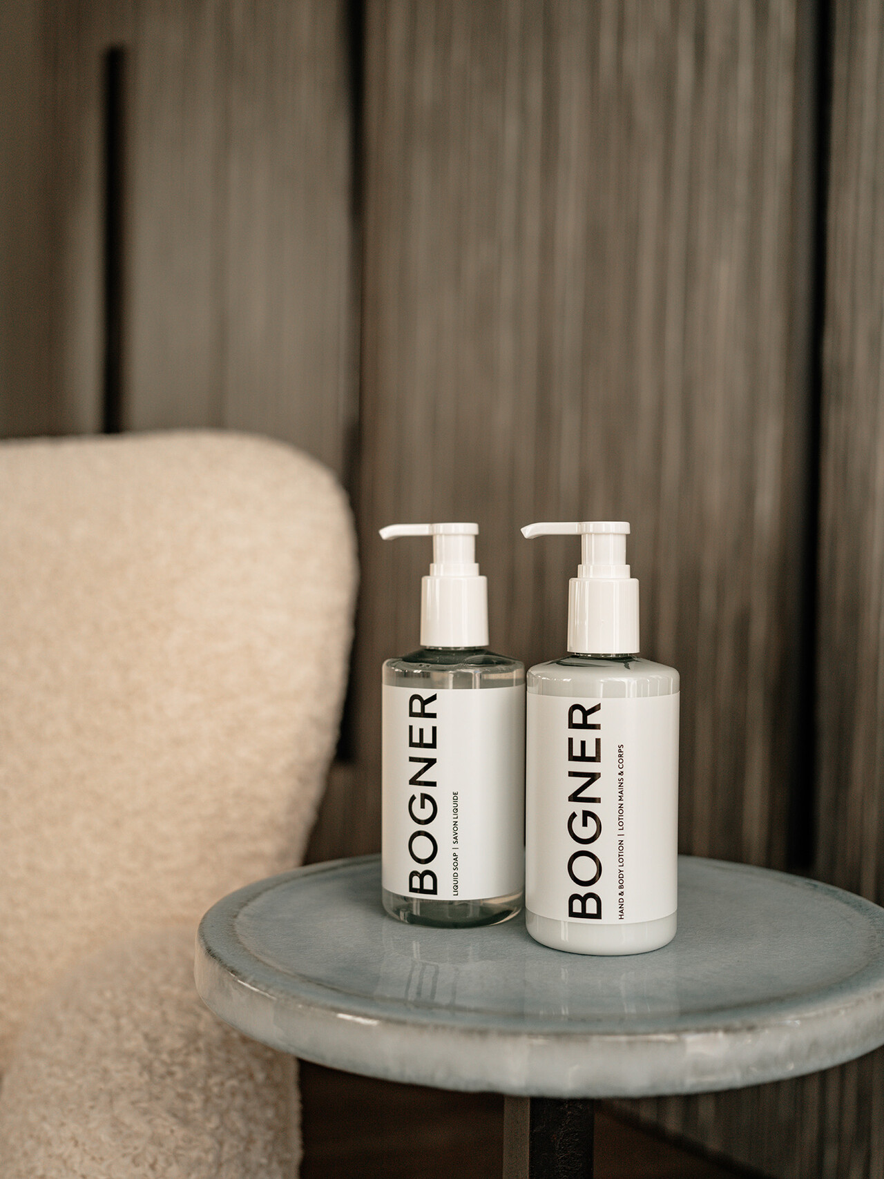 Напълно обновената линия е съставена от шампоан за коса и тяло, балсам, течен сапун, лосион за ръце и тяло и крем за ръце. Допълнителните удобства включват соли за вана и комплект за баня, докато закачливият сапун с форма на топка за голф подчертава спортното наследство на BOGNER.